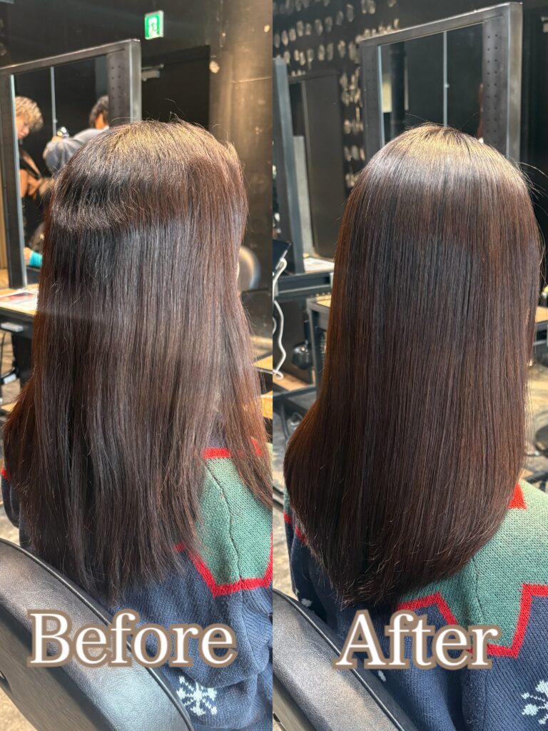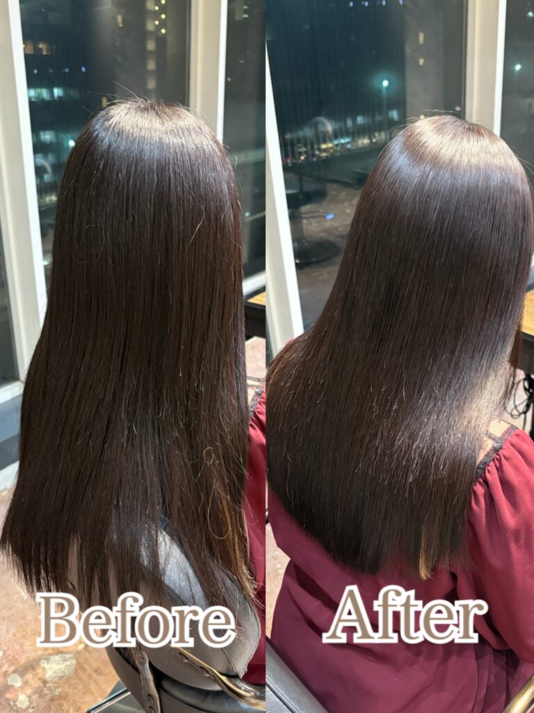 見た目の大きな変化はないですが、内側のうねりごわつく髪質、硬さがお悩みでした💦