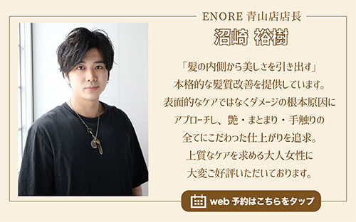 こんにちは。髪質改善と縮毛矯正が得意な美容院ENORE(エノア)青山店店長沼崎です。
