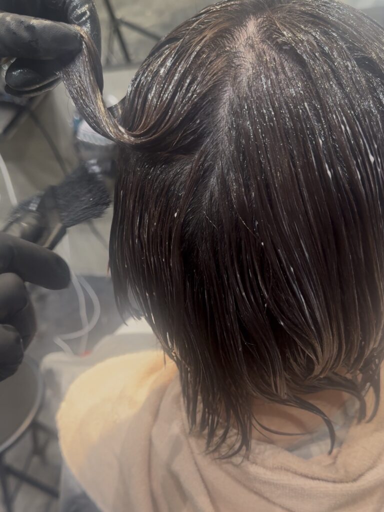 その際に、根本のリタッチ部分と、2回目にかけるところで薬剤の強さを調節してダメージを出さないよう配慮させていただきました♪