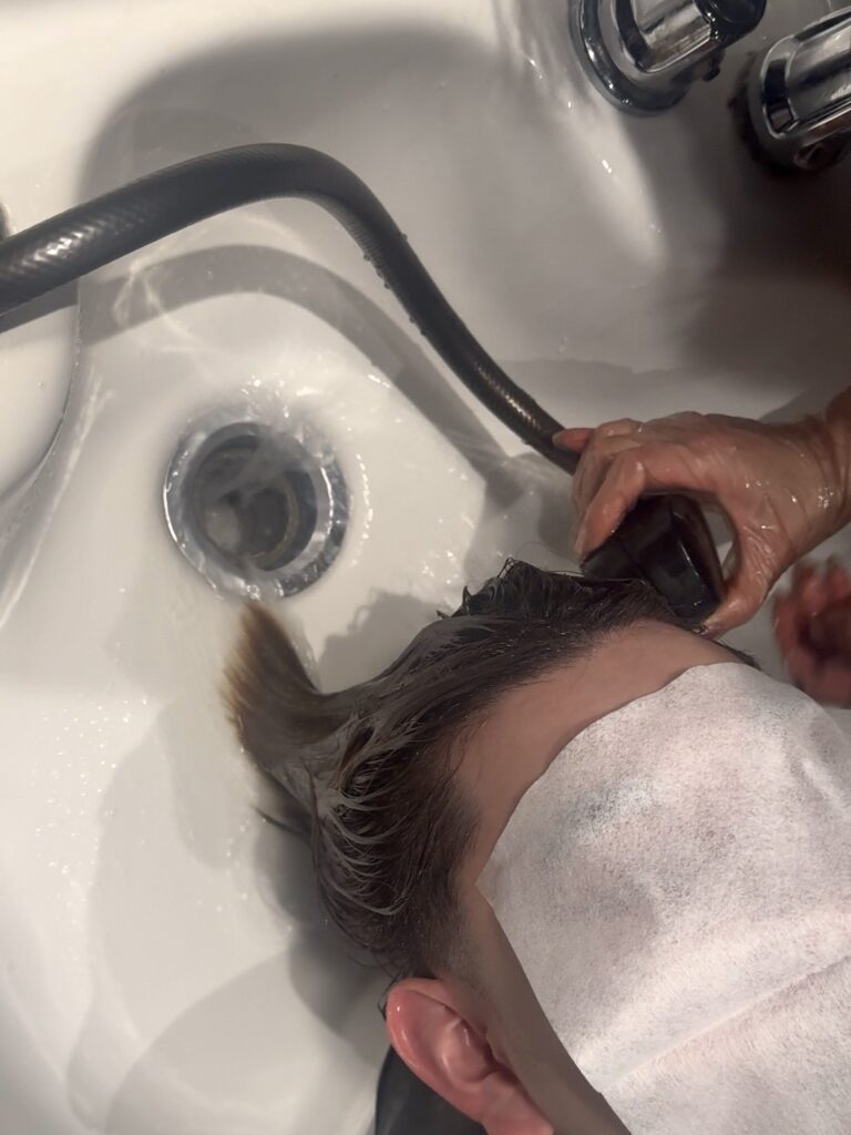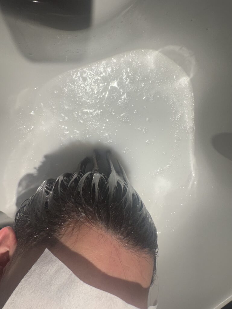 1剤の放置後、チェックをしてしっかり髪に反応して結合が切れていることを確認したら、シャンプーで流していきます。